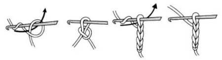 A la foto de sota podeu veure com encaixa la columna de ganxet. Cal lligar una cadena de diversos bucles d’aire. Introduïu el ganxo al bucle, agafeu el fil i tireu-lo enrere.