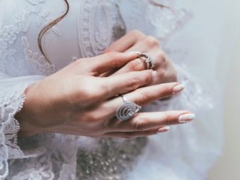 - Primer pla de les mans de la núvia. Amb dits prims, una noia pot contenir una flor, una targeta d’invitació, una cinta. Les imatges de dos anells posats en un palmell semblen ansiosos.