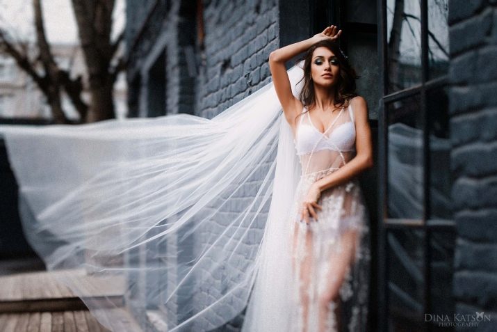 Una opció clàssica i guanyar-guanyar és un peignoir o chemise prima d’encaix. Una solució alternativa és la roba interior de cordons blancs de neu. Però val la pena tenir en compte que l’opció amb roba interior és més adequada per a aquells que tenen un cos ideal o gairebé perfecte, per a les nenes joves que no s’avergonyiran de les càmeres amb un vestit tan franc i es preocupen per les seves formes.