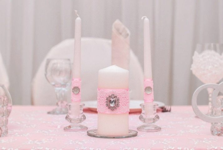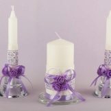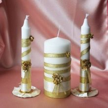 Si l’elecció de les espelmes a la botiga no és feliç, podeu fer de manera independent tots els accessoris necessaris. Les espelmes estan decorades amb comptes i strass, cintes i encaixos, arcs i petites figures de plàstic.
