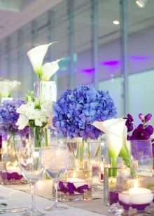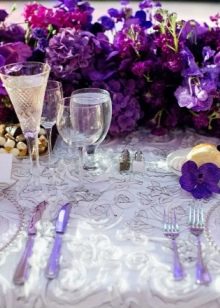 El mateix passa amb les espelmes. Si les espelmes són blanques, aleshores les espelmes escullen l’ombra del color del qual es decorarà tot l’esdeveniment. I també les espelmes petites morades es veuen boniques en gots transparents o gerros petits de vidre.