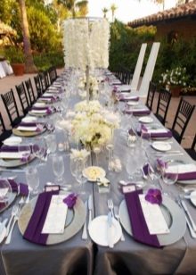 Els tovallons de color morat o morat fosc s’harmonitzaran perfectament amb els plats de color blanc de neu. A més, si escolliu tovallons blancs, els anells de tovalló han de quedar saturats amb una tonalitat morada.