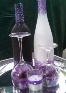Si els plats per a tots els convidats seran de color blanc clàssic, aleshores s’han de fer les ulleres dels herois de l’ocasió amb aquest color màgic. Podeu pre-ordenar bells patrons, dibuixos o inscripcions que s'aplicaran a gots clàssics amb una tonalitat morada. I podeu comprar ulleres parellades de l’ombra desitjada.