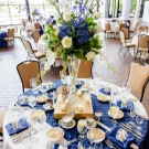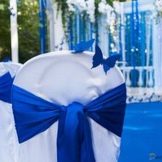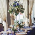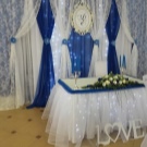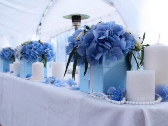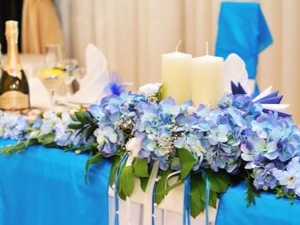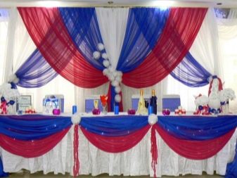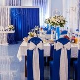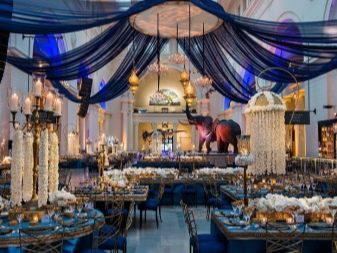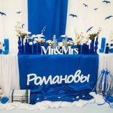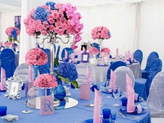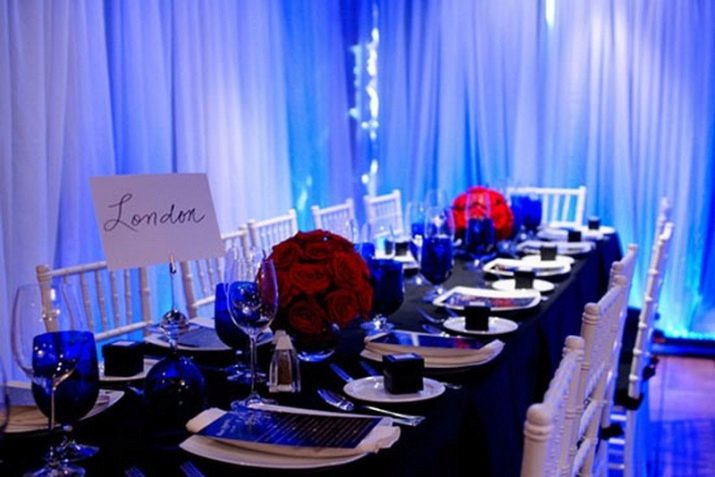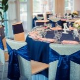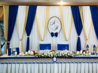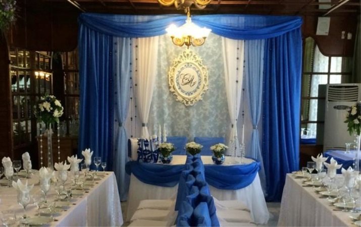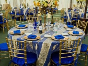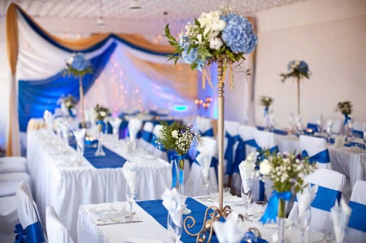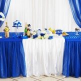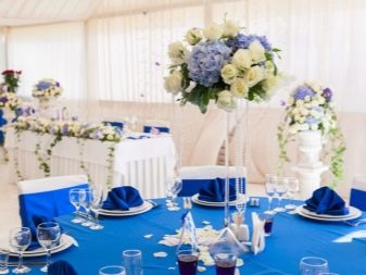 - L’ús de colors blau i blanc en el disseny de la sala i les taules de banquets permet crear una geometria clara de la decoració, posant l’èmfasi en la solemnitat de les vacances. La núvia, trobant-se a la taula central amb un elegant marc blau de cortines, se sentirà com a l'escenari, cridant l'atenció de tothom.