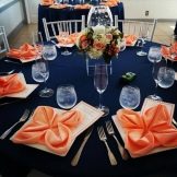 - La decoració del saló i la taula de festes en tons blaus dóna a l’ambient intimitat. Un mantell blau fosc a la taula, els tovallons blaus marins de les plaques contrasten amb els brillants accents de roses vermelles.La imatge general és reial contenida i alhora magnífica.