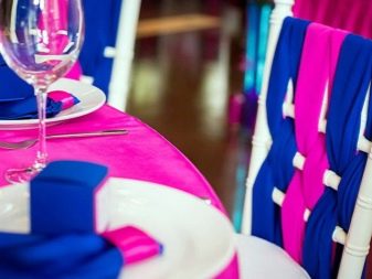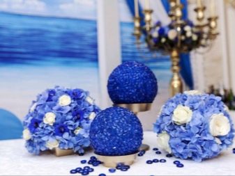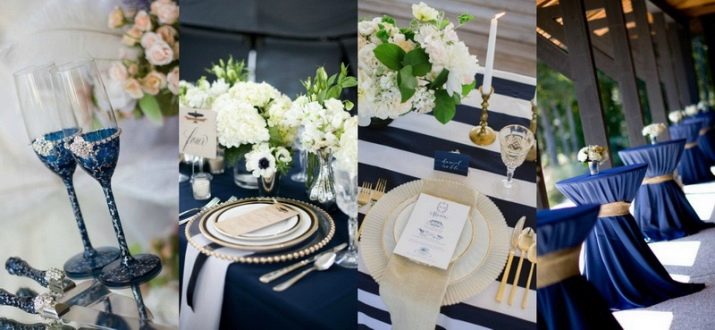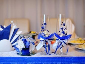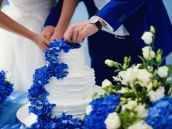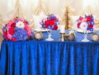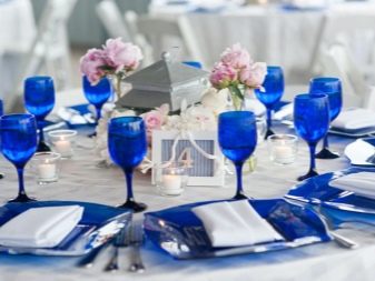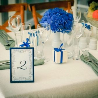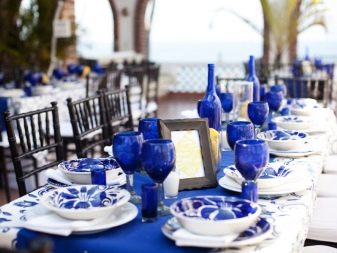 Vaixella per a una taula de noces s’ha d’escollir amb un patró d’atzur o safir, per exemple, vegetal. Apte per decorar tovallons completament blaus. La gamma general es complementa amb baies i fruites en gerros, deixant el to adequat. Pot ser raïm, nabius, nabius o prunes.
