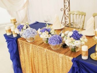 La combinació de blau amb or implica luxe. Com que el color principal està seleccionat de la paleta blava, els detalls es destaquen en or. Per exemple, un tovalló o fins i tot una cadira poden ser d’ultramarina, i la decoració està feta en or. Que s’hagi refinat, no s’ha de deixar portar per tons daurats. La riquesa ha de ser moderada.