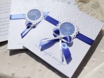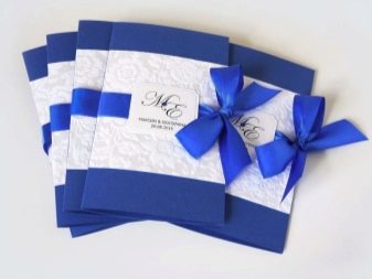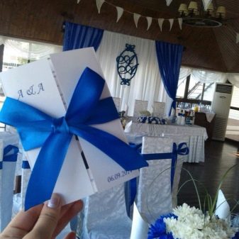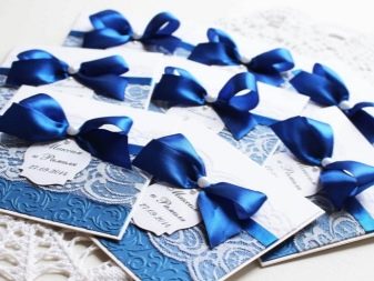 Qualsevol casament comença enviant invitacions. Han de ser coherents amb el concepte global de creació del disseny de l’esdeveniment en conjunt. Perquè les targetes d’invitació semblin especialment impressionants, es poden imprimir en paper blau gruixut. Les lletres haurien de correspondre a la segona ombra escollida per a la decoració. El color del sobre també pot ser el mateix per emfasitzar el contrast amb el to de la targeta d'invitació.