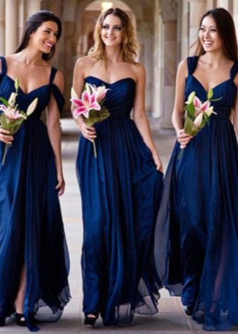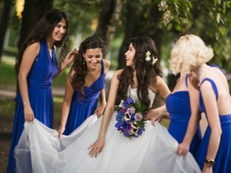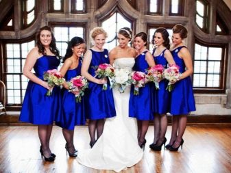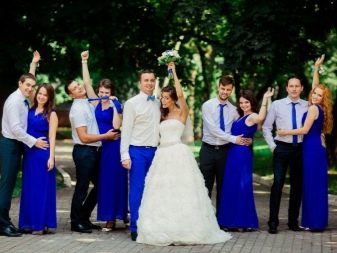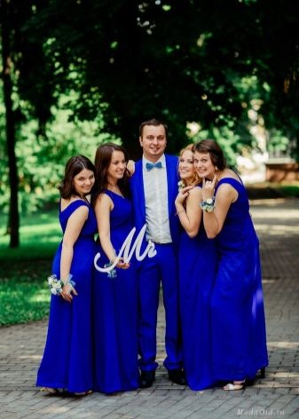Per emfatitzar l'estil de l'esdeveniment, és recomanable que les dames d'honor trien vestits d'una sola gamma. Si la núvia porta un vestit blanc, aleshores aquestes noies opten millor per triar el blau fosc o, per exemple, els tons celestials del vestit. En aquest context, l'heroi de l'ocasió es veurà encara més elegant. Al mateix temps, els vestits de la núvia i les núvies es complementaran. Els amics del nuvi poden portar jaquetes de color blau o blau gris. O podria ser una combinació de pantalons lleugers amb jaquetes blaves.