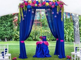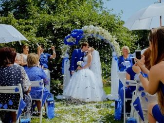 Si el carrer és càlid i el registre es fa sota el cel obert, el lloc on hi haurà la núvia i el nuvi s'ha de decorar amb un arc amb blau i els colors seleccionats. Es crea utilitzant brots de flors, tul o cintes. Una bona opció és utilitzar globus per a això: blanc i blau o blau i blau, depenent de l’esquema de colors escollit.