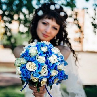 Un vestit blanc clàssic es pot complementar amb un cinturó blau, brodats o insercions de blau flors de blat de moro o alguna altra tonalitat interessant, així com decoracions del to corresponent. Pel que fa al ram de la núvia, cal triar flors blaves i blanques, per exemple, roses o flors silvestres, plantes de jardí de colors adequats.