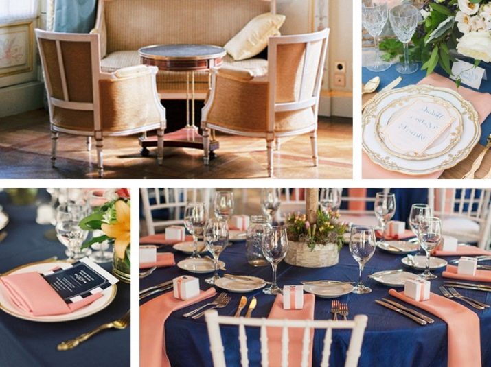 La decoració de la taula en tons blaus de préssec sembla molt atractiva i inusual. El blau fosc és el principal a les habitacions lluminoses. Si el lloc del casament implica crepuscle, és més important utilitzar el color del préssec en el disseny.