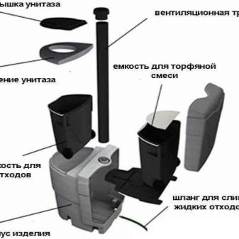 El cas en si mateix és fabricat per fabricants de plàstic d’alta resistència, per comoditat hi ha un seient de vàter i una tapa ajustada, que sempre s’ha de baixar. El vàter està connectat als compartiments inferiors ocults mitjançant una canonada de desguàs. Abans de l'inici del funcionament, el dipòsit de torba s'omple per 2/3 amb un compost de compostatge. No obstant això, la seva quantitat pot variar segons el model i les recomanacions del fabricant.