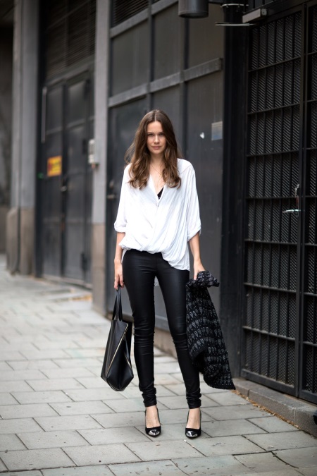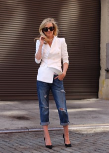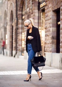 Els texans blaus: els nuvis d’estil masculí, en una unió estilística inusual amb una tapa lleugera i una gran jaqueta blanca, es combinen molt harmònicament amb les bombes clàssiques de pell de taló alt. Una bossa negra gran serà el millor complement del vestit.