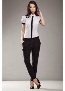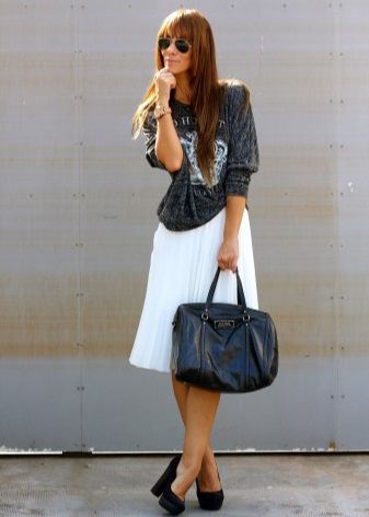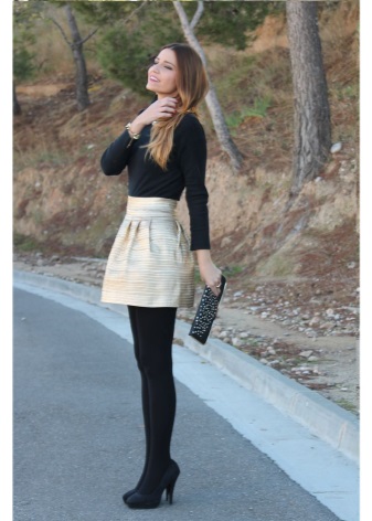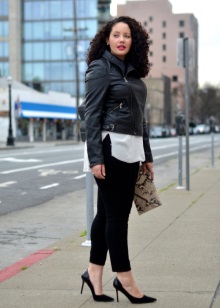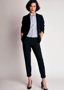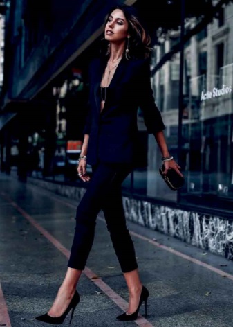 Un vestit elegant que és adequat fins i tot per a una sortida nocturna està format per una combinació clàssica de coses: faldilles: un llapis fet amb puntes elegants de neu i una jaqueta de color negre. Les sabates de punta oberta complementen perfectament el vestit.