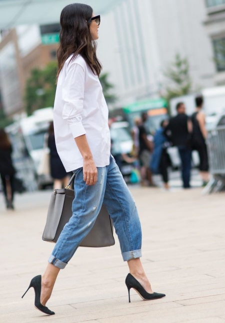 Un aspecte urbà elegant, que combina una samarreta blanca de cotó de grans dimensions amb uns texans lleugers (nòvio escruffy) es complementa perfectament amb elegants bombes de cuir negre.