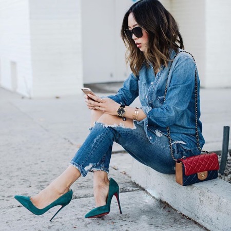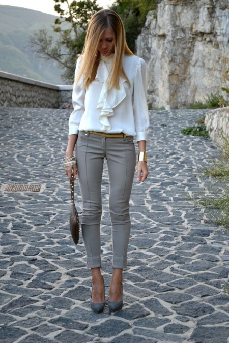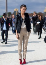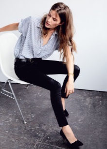 Elegància i concisió. Els vestits estrictes, els llaços d’oficina amb faldilla de llapis i els pantalons són adequats per a aquest estil. La combinació perfecta serà de suede negre i versions blaves i blau brillant de sabates amb talons diferents. Les bombes clàssiques de suedja aportaran espècies al look. Per als pantalons rectes, és adequat un taló mínim. Però amb el taló, els pantalons prims i els seus llargs del turmell tenen un aspecte excel·lent.