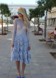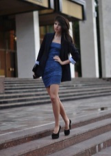 De moda i popular, color blau. Tant en roba com en sabates, no deixarà indiferent a ningú. Si el blau té una ombra de “indigo”, podeu substituir les sabates negres amb seguretat. Aquest color aportarà brillantor a la imatge. El principal no és anar massa lluny amb les flors de la imatge.