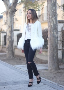 Per cada dia. Aquí hi afegim texans o pantalons blancs a sabates de plataforma brillant, o sabates amb talons gruixuts. Per sobre, podeu triar el color de les sabates o jugar en contrast.