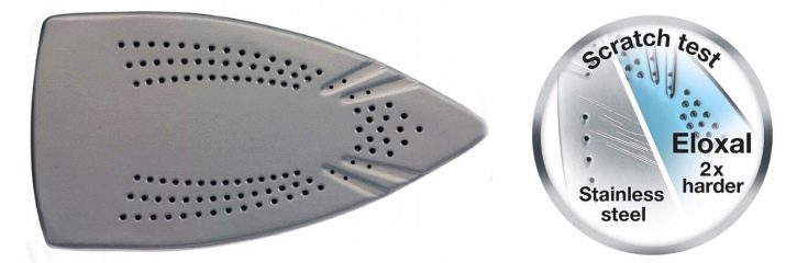 - Sola de ferro de Eloxal fet d’aliatges d’alumini. Es processen i s’oxiden amb una solució d’electròlits. Això permet que el metall sigui més durador i serveixi durant molts anys. La base té una bona protecció contra l'oxidació i llisca perfectament sobre la superfície de la tela. Després d'utilitzar aquests dispositius, la roba no es veurà atrapada ni danyada.