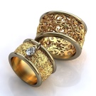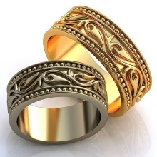Si voleu obtenir una decoració més original, heu de mirar models amb patrons de noces. Avui dia, les núvies trien molt sovint aquestes opcions. La superfície d'aquests anells us permet col·locar patrons grans i perceptibles.