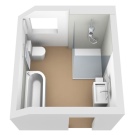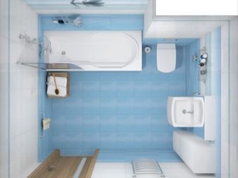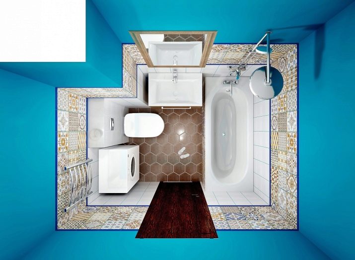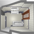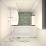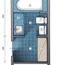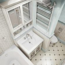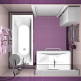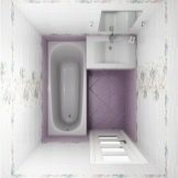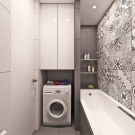 En aquest cas, la rentadora s’ha de col·locar en una de les cantonades lliures o bé al llarg de la paret davant de la banyera. No ens hem d’oblidar dels armaris penjats, decorats amb miralls i ulleres. Permet dissenyar i utilitzar elements tan simpàtics com gerros de flors, pintures petites.