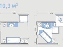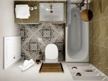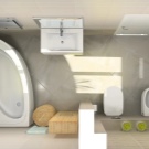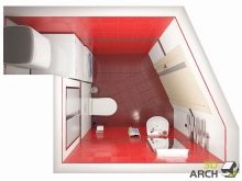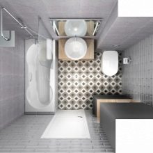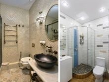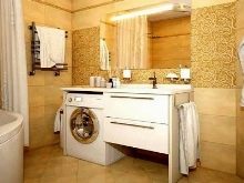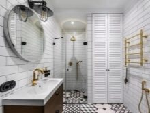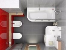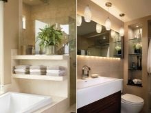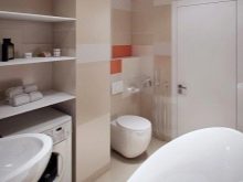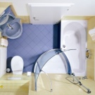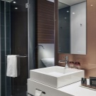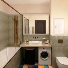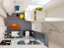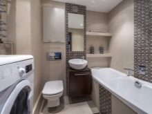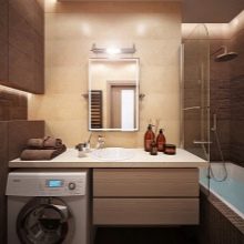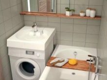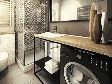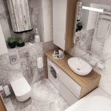 - A la petita habitació combinada amb la unitat sanitària hauràs de negar-te a instal·lar una rentadora (a excepció de col·locar-la sota una pica de líquid d’aigua), en aquest cas el millor és col·locar-la a la cuina o al passadís. S'haurà de substituir un lavabo convencional per un model més compacte, el mateix s'aplica a la banyera; en canvi, s'adapta bé una cabina angular. Es recomana utilitzar material amb una superfície mirall en la decoració: aquesta ampliarà visualment l’espai de l’habitació.