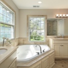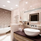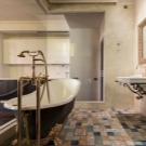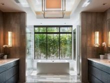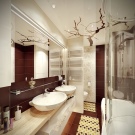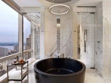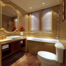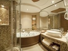 A la majoria de mansions, el bany té una superfície d’uns 10 m2. Gràcies a una mida tan impressionant, és possible organitzar una zona d’hostes, caracteritzada per l’alçada del pis. El resultat és una àrea petita amb l’equipament necessari, dissenyat per als clients. L’altra zona, que consta d’una gran pica, banyera i dutxa, hauria d’estar bloquejada per una pantalla o una porta lleugera. A més, el disseny ha de preveure retroil·luminació, el millor és instal·lar-lo a prop del mirall, a les zones de relaxació s’ha d’escampar.