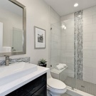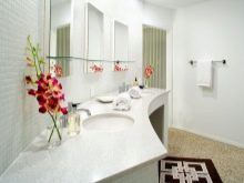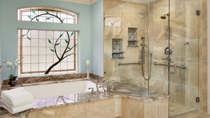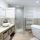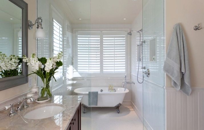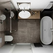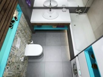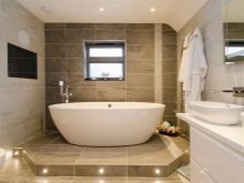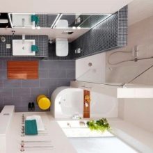 En un bany amb quadratura estàndard, sovint s’utilitzen diversos trucs de disseny per ampliar l’espai visualment. Pel que fa a equipar una habitació en un edifici nou amb un disseny millorat i una casa privada, on no hi ha problemes amb la mida de l’habitació, podeu col·locar amb seguretat voreres, armaris, grans embornals i electrodomèstics.
