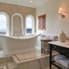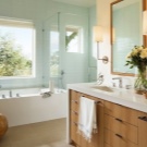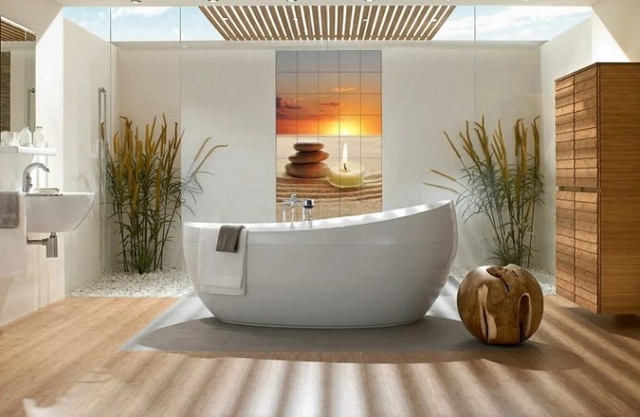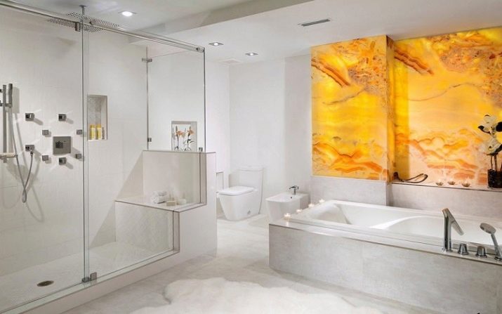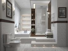 A més de tot això, durant la zonificació de l’espai als banys, sovint s’instal·len envans, però no han d’interferir en la lliure circulació. En cas contrari, l’habitació crearà sensació de disharmonia i malestar. En habitacions espaioses, podeu separar zones amb l'ajuda de mobles elegants.