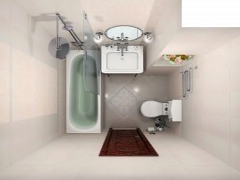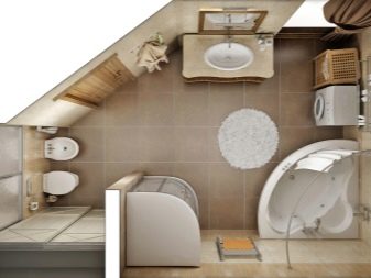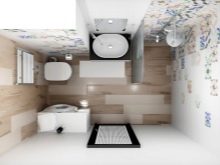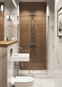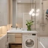 Podeu estalviar espai amb l'ajuda de mobles de cantonada i les mateixes parades de dutxa; en aquest cas, la rentadora es col·loca millor en un armari encastat, la part superior perfecta per guardar tovalloles i productes d'higiene personal. Per ampliar visualment la sala, Per a la decoració, s'han de seleccionar materials lleugers (blanc, beix i tons de llet) amb una superfície de mirall.