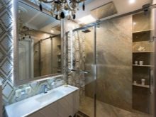 Per no limitar l’espai, es recomana instal·lar la rentadora sota el lavabo. S'han de fer tots els elements estructurals acer inoxidable - Això aportarà, a més, a l’interior un brillo inusual i elegant. Cortines mate i envans de vidre complementen el disseny. És recomanable triar miralls en un bonic marc, ja que es convertiran en el tema principal de l’interior. Si l'habitació té una finestra, ha d'estar decorada amb persianes o persianes de tons apagats.