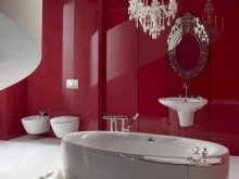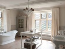 En aquest cas, es recomana decorar la finestra amb cortines obertes lleugeres. Si els propietaris de la casa els encanten l'ambient romàntic, el bany hauria de tenir una finestra rodona. Per tal que s’ajusti harmònicament a l’interior general, heu de triar un estil oriental per a la decoració de l’habitació, preferint els colors vius. Pel que fa a la fontaneria, podeu adquirir banyeres d’acer i de fosa. Per afegir un ressalt a l’interior ajudarà el lavabo i el lavabo de color vermell, que serà interessant mirar en el fons d’una rajola de color blanc de neu.
