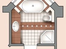- En banys de superfície mitjana (5, 6 i 7 metres quadrats) sol realitzar la disposició simultàniament amb diversos dispositius d’higiene personal: una caixa de dutxa i un recipient de bany. Només en aquest cas, heu de triar la versió angular de la col·locació de la fontaneria. Els lavabos de formes irregulars tenen un aspecte excel·lent en una habitació gran i llarga i s’adapten fàcilment a nínxols que fan la funció de conductes de ventilació. També es pot instal·lar una estructura de rentat en un d'aquests obsequis. Una disposició massa estreta del bany hauria d’incloure la instal·lació d’un lavabo cantoner, al costat del qual es col·loca immediatament un recipient de vàter; una cubeta o banyera de dutxa s’ajustaran amb èxit al llarg de la paret oposada.