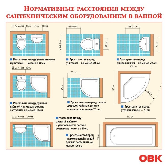 A part això, és important tenir en compte les normes en la col·locació de la fontaneria, de manera que hi hagi algun espai per al moviment. Per tant, almenys 50 cm haurien de romandre davant del vàter, 60 cm davant de l’aigüera, així com la rentadora, i 80 cm davant del lavabo i directament el bany.