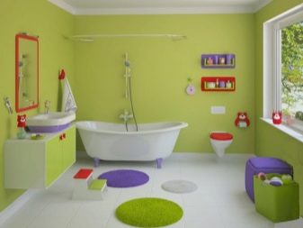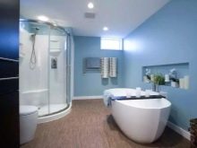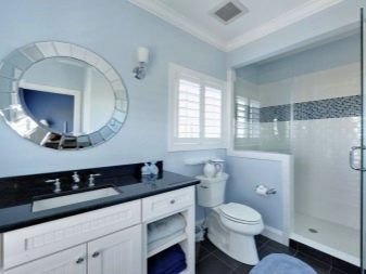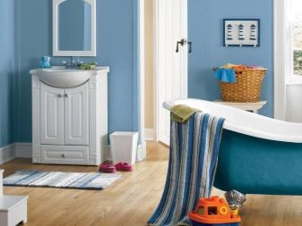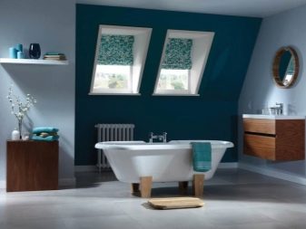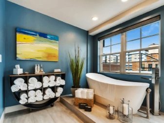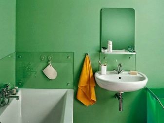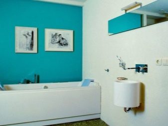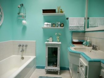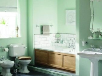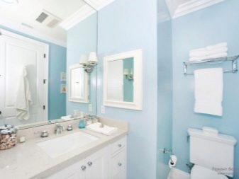 Disseny d’un bany amb parets pintades requereix una acurada selecció de colors. Pot ser una aplicació de fons de colors vius - blau, cian, verd, turquesa. Aquest acabat és adequat per a habitacions petites i espaioses. Podeu accentuar només una paret o diverses superfícies adjacents alhora. Es poden combinar colors vius amb blanc neutre o gris clar.