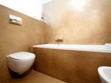 La decoració d’interiors del bany requereix un enfocament especialment curós en la selecció dels revestiments decoratius. Els panells de plàstic no sempre estan a l’altura de les seves expectatives. Les rajoles decoratives no són rellevants per a tots els estils de disseny. Els minerals naturals i les roques dels habitatges de mida petita ordinària semblen massa pomposos i pesats. Gairebé totes les millors idees actuals es basen en l’ús de la pintura: un modern, formant un revestiment transpirable amb una textura suau o rugosa.