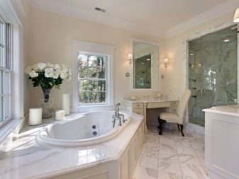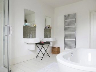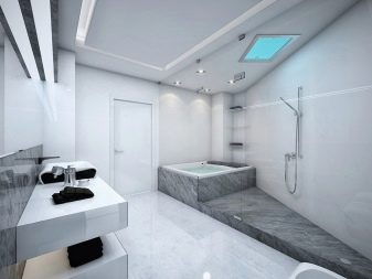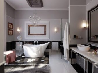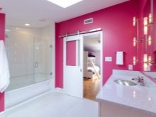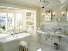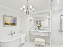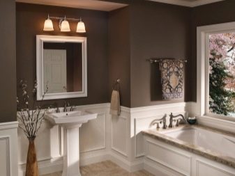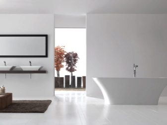 Les parets a l'ombra de la neu no són la millor opció per a un bany; aquí, un to més llet o cremós sembla més noble. Podeu “diluir” un interior d’aquest tipus amb accessoris brillants i contrastants. El color vermell, negre, vi, marró s’ha d’utilitzar amb precaució, amb la seva ajuda es pot fer un patró gràfic o destacar una paret.