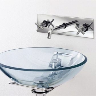 - Vidre. Els equips de fontaneria fabricats amb aquest material s'han posat de moda fa relativament poc i avui en dia són un competidor amb èxit de la tradicional porcellana i el pressupost pressupost, mentre que no són absolutament inferiors a ells. L’únic menys d’aquest equipament és la laboriositat de tenir-ne cura, fins i tot les taques més petites, les esquitxades i les ratlles d’aquest material no són només visibles, literalment cridaners, per tant, s’ha de rentar i eixugar diàriament un lavabo de vidre.