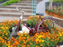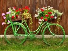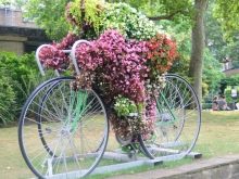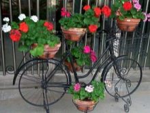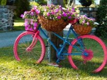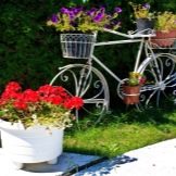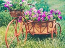 El vol de la fantasia és il·limitat: podeu decorar una bicicleta antiga amb pots de fang, gerres. Una solució pràctica serà l’ús de testos de plàstic de mida petita. Si es barreja contenidors de diferents mides i formes, es pot crear una versió única d’una bicicleta de flor de flors. L’assortiment de plantes depèn de la ubicació del jardí de flors. Podeu decorar un llit de flors amb anuals (petúnia, verbena, lobèlia, begònia, oblidem-me-no, fúcsia, pelargoni).