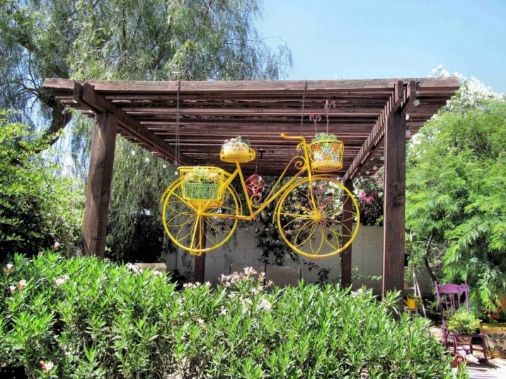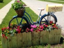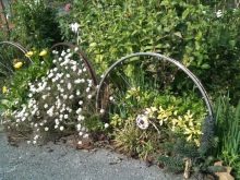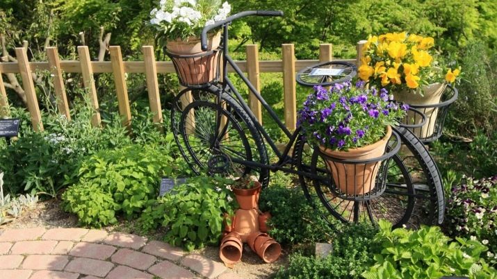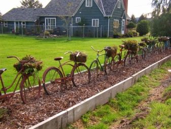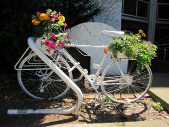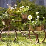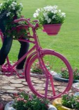 Opcionalment, es pot utilitzar per decorar el paisatge del jardí i elements individuals d’una bicicleta antiga. Per exemple, pot ser un volant o rodes. D’aquests, podeu crear llits de flors creatius, es poden utilitzar rodes com a suports, per exemple, un banc de jardí. Per evitar que es pugui rodar pel territori, les rodes es fixen sobre una base de formigó.