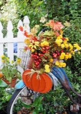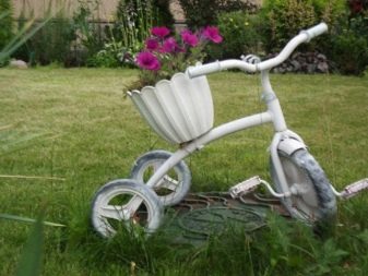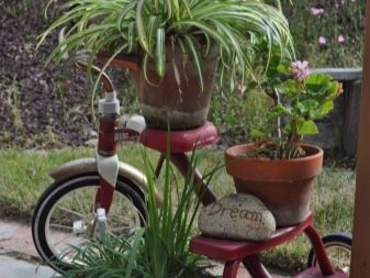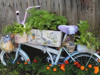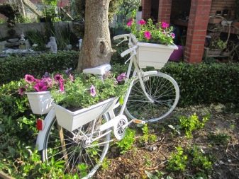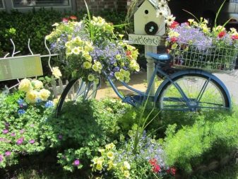 El disseny de la composició de la bicicleta pot ser diferent. De vegades utilitzen els complements més inesperats. Per exemple, pot ser figures de jardí (gnomes, personatges de fades, ocells) o fins i tot ninots. Una bicicleta de llit de flors es pot decorar amb palla, així com pedres de diferents mides. En alguns casos, està decorat amb molsa, cosa que dóna al paisatge un aspecte especial.