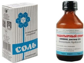 - Una solució d'amoníac i sal. En un got d’aigua, cal dissoldre dues culleradetes de sal i una culleradeta d’amoníac. S'aboca la solució en un polvoritzador i es ruixa a la superfície del collet. Perquè la solució no penetri a la pell, es gira el producte sobre un drap net amb la pell cap avall i es deixa durant 30 minuts. A continuació, es neteja la pell amb una esponja suau i humida, i es treu la solució restant de la pila.