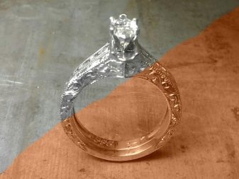 En aquest cas, els amos s’adhereixen a la mateixa tecnologia i quan treballen amb or blanc. La diferència principal rau en l’aplicació parcial del rodi a la superfície del producte. El fet és que amb el pas del temps, el metall base sortirà gradualment a través d’una capa addicional. Com a resultat, l’aspecte de la decoració es deteriorarà, es viurà l’estètica.