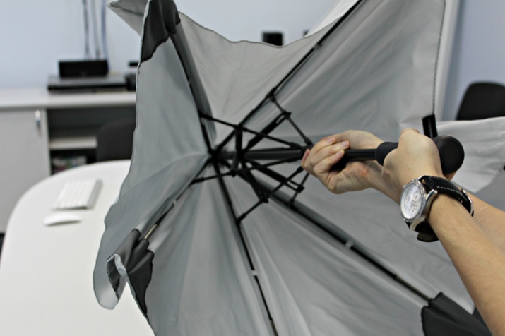 Si el paraigua té una estructura plegable, és important assegurar-se que la varilla sigui fiable. No dubteu en agitar-lo una mica de forma totalment desplegada: si les seccions s’agiten, aquest paraigua no durarà gaire.