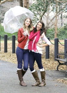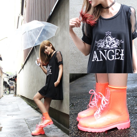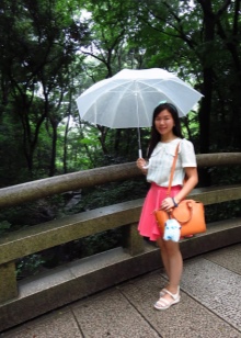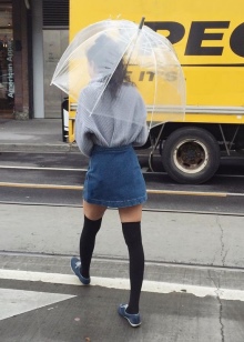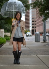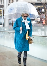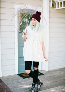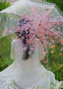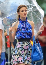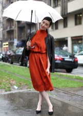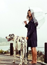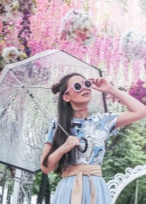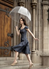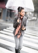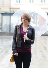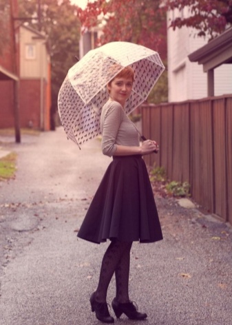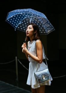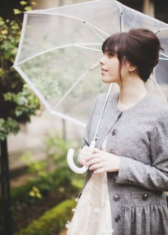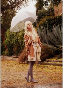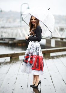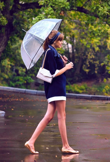 Per crear un look femení, podeu triar un paraigua transparent amb estampats romàntics en forma de pèsols o cors. És millor triar roba de color clar: una falda blanca en silueta A, una brusa amb bells patrons. La bossa ha de ser de tons neutres i les sabates han d'estar en una sola o plataforma gruixuda, cosa que us permetrà no mullar-vos els peus mentre camineu sota la pluja.