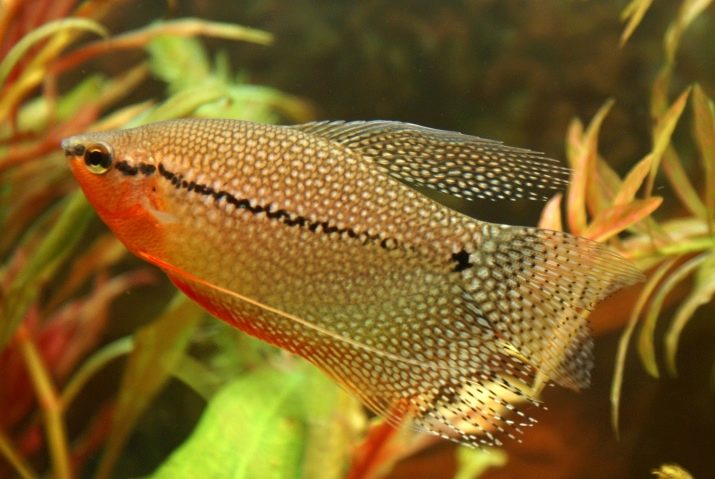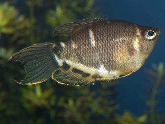 - hnědá nebo hadcová gourami olivové barvy s tenkými příčnými pruhy;