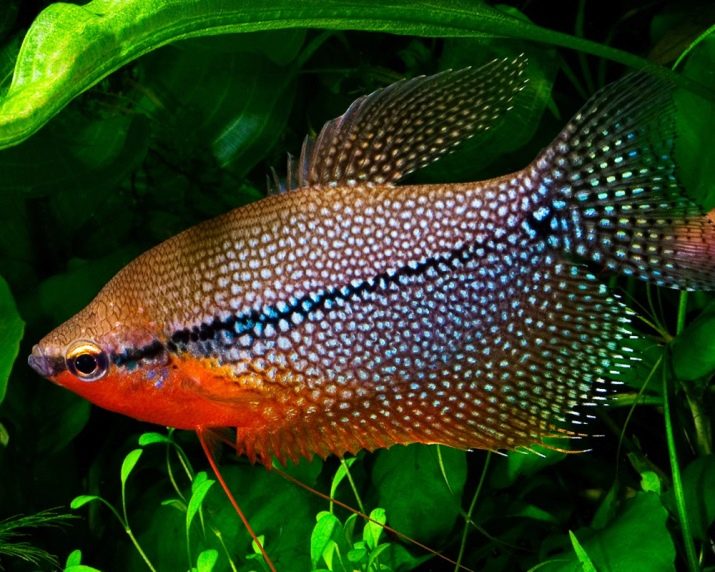Hnědé tělo ryby je pokryto modrými skvrnami střední velikosti a má červený podélný pruh od hlavy k ocasu. Na namodralých ploutvích jsou červené skvrny a hranice stejné barvy. Jasně modré oči mají červený lem. Je zajímavé, že během páření jsou trpaslíci gourami schopni vydávat dunivé zvuky. Voda pro takové ryby vyžaduje mírně kyselé nebo neutrální.