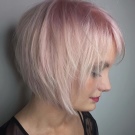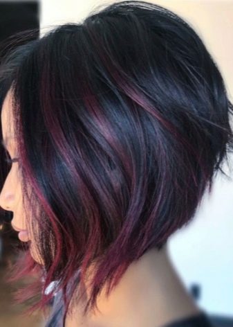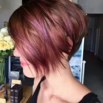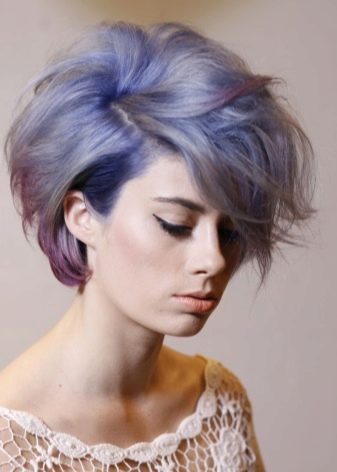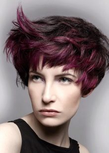 Milovníci zakázkových a avantgardních řešení budou určitě jako objemní a lehce nedbalý krátký účes, malovaný technikou balayazh. Fialové a vínové odstíny, stejně jako jejich hladké přechody ze světlejších do tmavých tónů, budou zde vhodné. Takové řešení bude vypadat velmi originální. Díky boční části a oholenému chrámu to bude ještě výraznější.