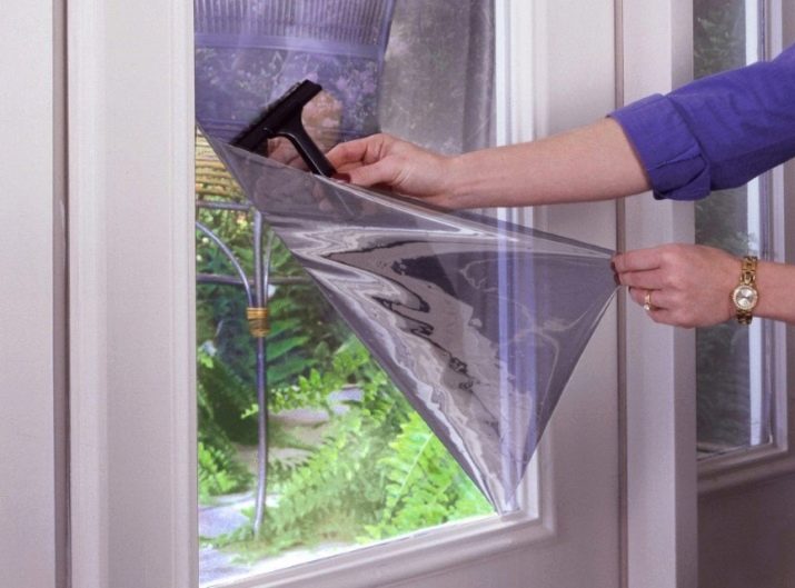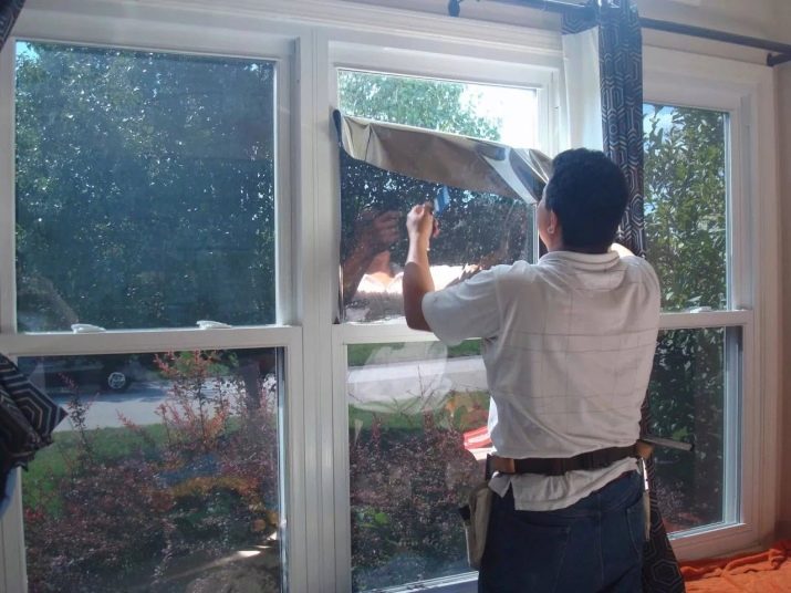 Fólie musí být nařezána na potřebné části. Poté se lepicí strana a samotný povrch postříkají vodou. Materiál přilepte shora dolů a postupně jej vyhlazujte špachtlí a hadříkem, aby nedošlo k tvorbě bublin. Pokud lze sklo z rámu vyjmout, usnadní se tím práce. V této situaci by tónování mělo být provedeno s malým okrajem, takže pak můžete okraje oříznout.